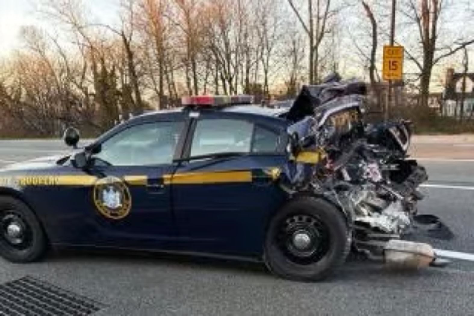 Four minutes later, a gray Jeep Wrangler plowed into the rear of the state police car, pushing it from the right lane into the center and left lanes. The Jeep came to rest on the right shoulder.