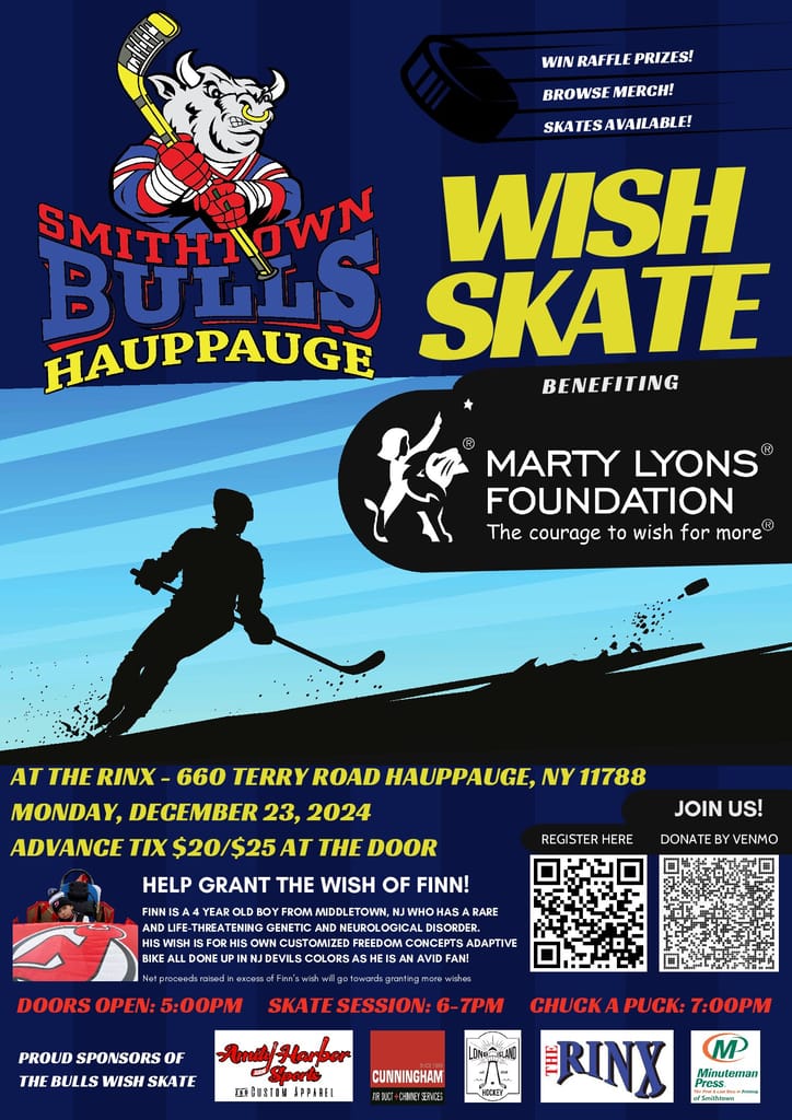 The Smithtown-Hauppauge Bulls hockey team, in collaboration with the Marty Lyons Foundation and Long Island Hockey Co., is spreading holiday cheer this year with a heartwarming “Wish Skate” event.