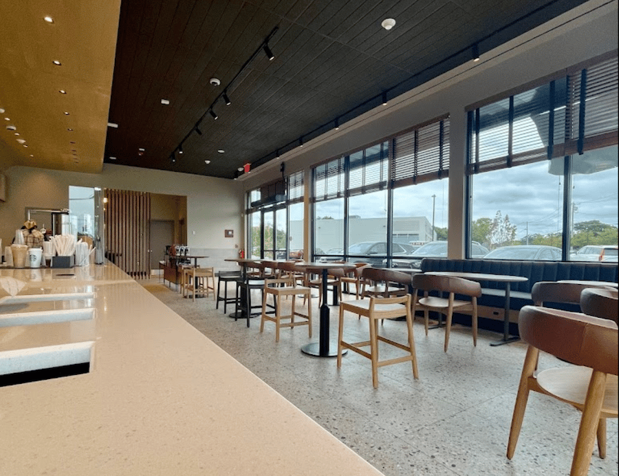 Top: Inside of the new Starbucks located in Port Jefferson Station. (Credit: Google Review/Nino Rezesidze)