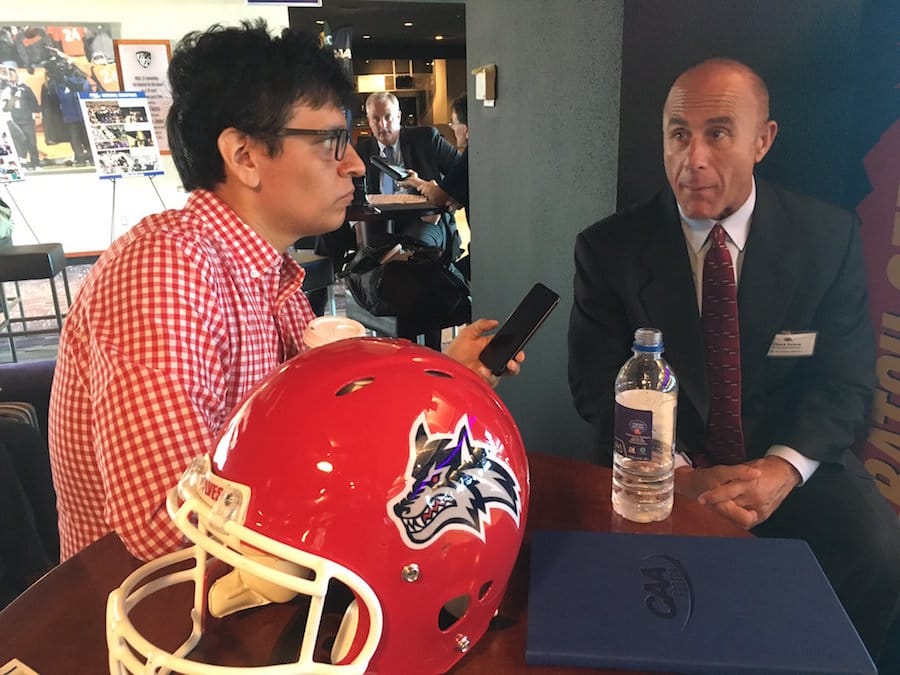 Top: Adam Peck interviews Stony Brook football head coach Chuck Priore. (courtesy photo)