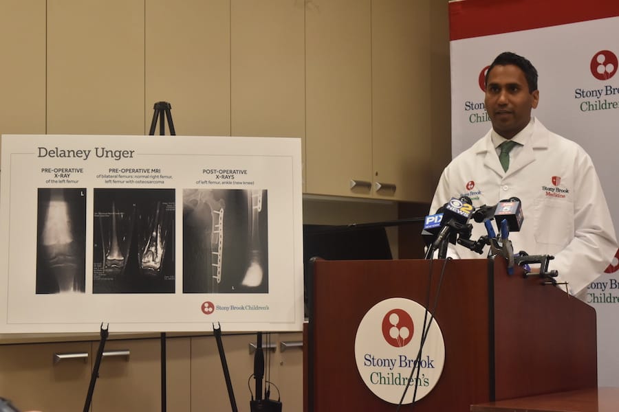 On April 5, 2017, Stony Brook’s team of doctors — Khan, Dr. Jason Ganz, and Dr. Nicholas Divaris — successfully removed the cancerous tumor and reconfigured the Selden Middle Schooler’s leg.