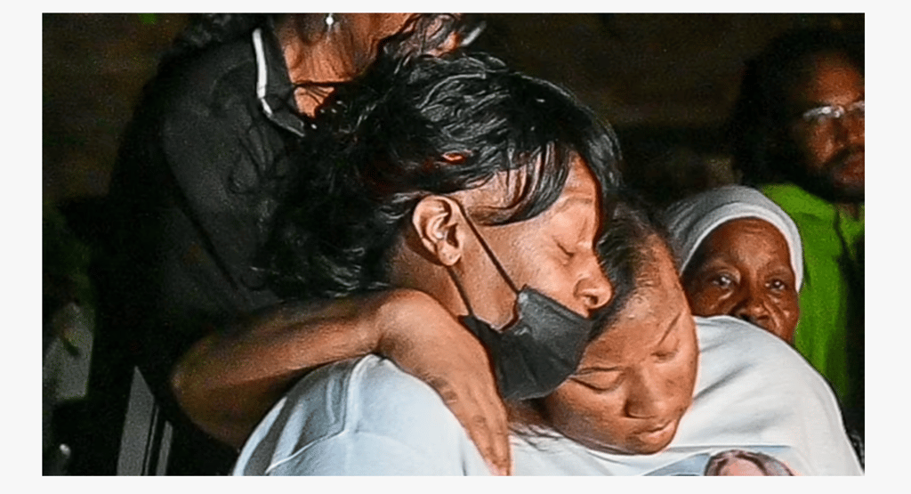 Photo: Seikeya Jones’ mother, Yolanda Terrell, in mask, hugs daughter Dijonzhane Johnson during a candlelight vigil Friday near the Huntington complex where Jones’ body was found earlier in the week. Credit: Howard Simmons/Newsday