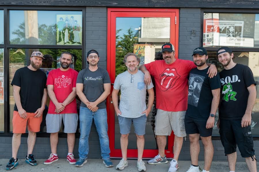 Jeff Berg (center) and his staff at Record Stop on Railroad Avenue in Patchogue last week. (Credit: Nick Grasso/GLI)
