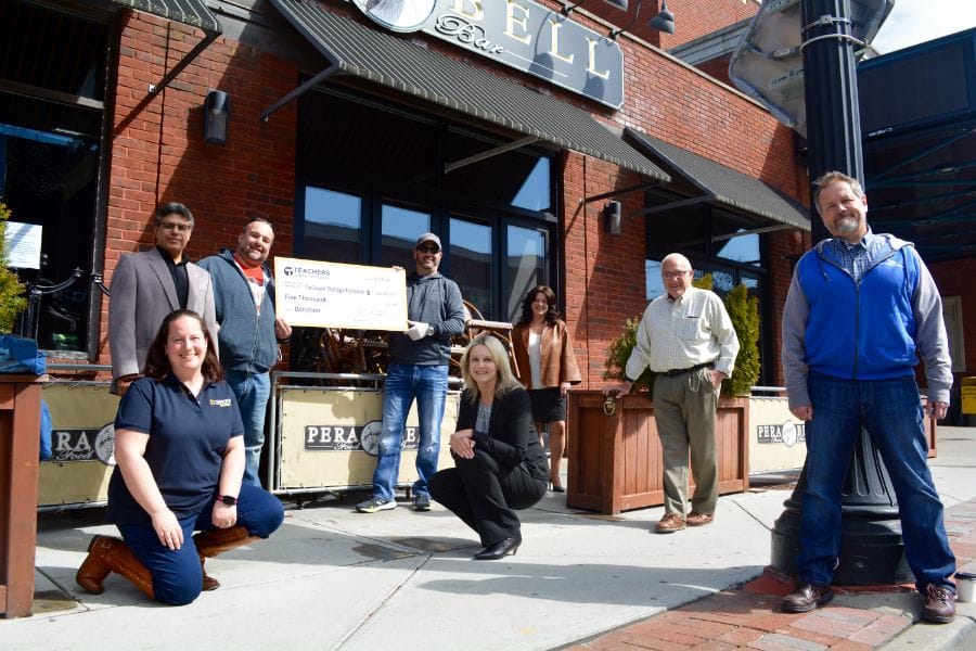 TFCU representatives on Friday presented a $5,000 check to the restaurants in front of PeraBell Food Bar to be used to help feed the frontline workers in the throes of the coronavirus crisis at Stony Brook and Long Island Community hospitals .