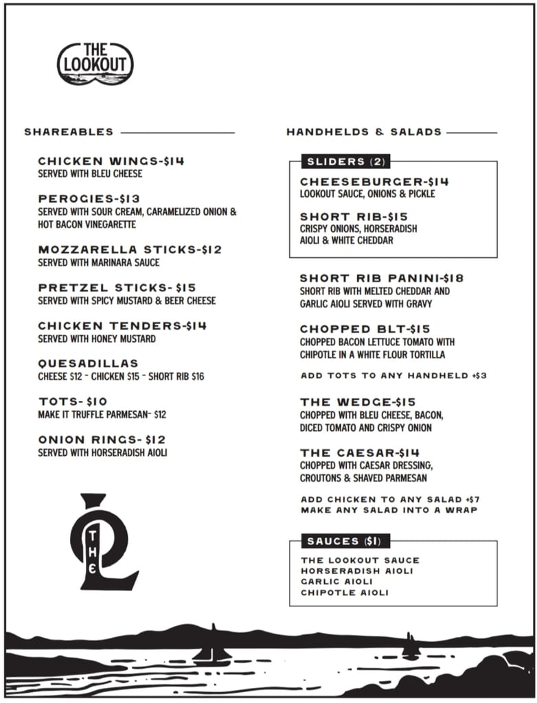 The Lookout opens daily at 11 a.m., with a full bar, eight beers on tap, a scratch-made cocktail list.