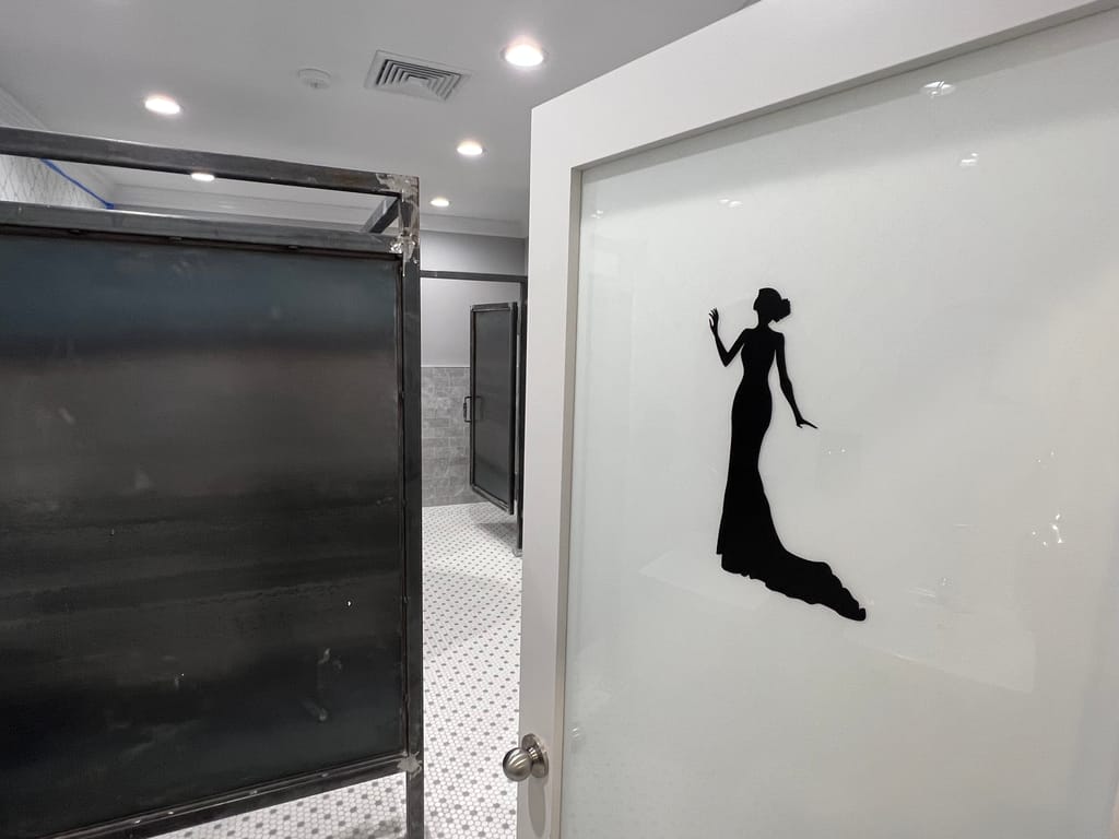It’s lined with mirrors, brass vintage chandeliers, high ceilings and a massive bar. There’s a bridal suite in the back, along with two huge bathrooms. Check back shortly for more photos.