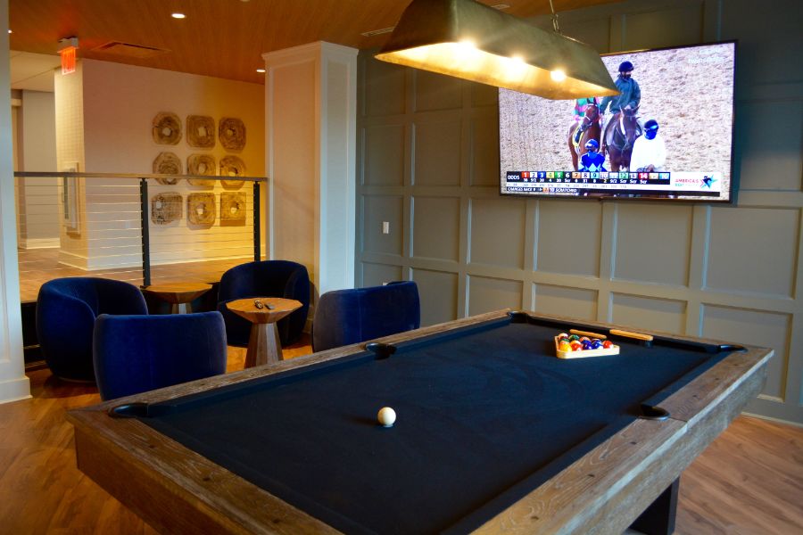 That includes the rooftop lounges, spacious courtyard, outdoor fire pits, a dog run, a community and business center room, fitness center and billiards area. (Scroll down for inside and outside photos.)