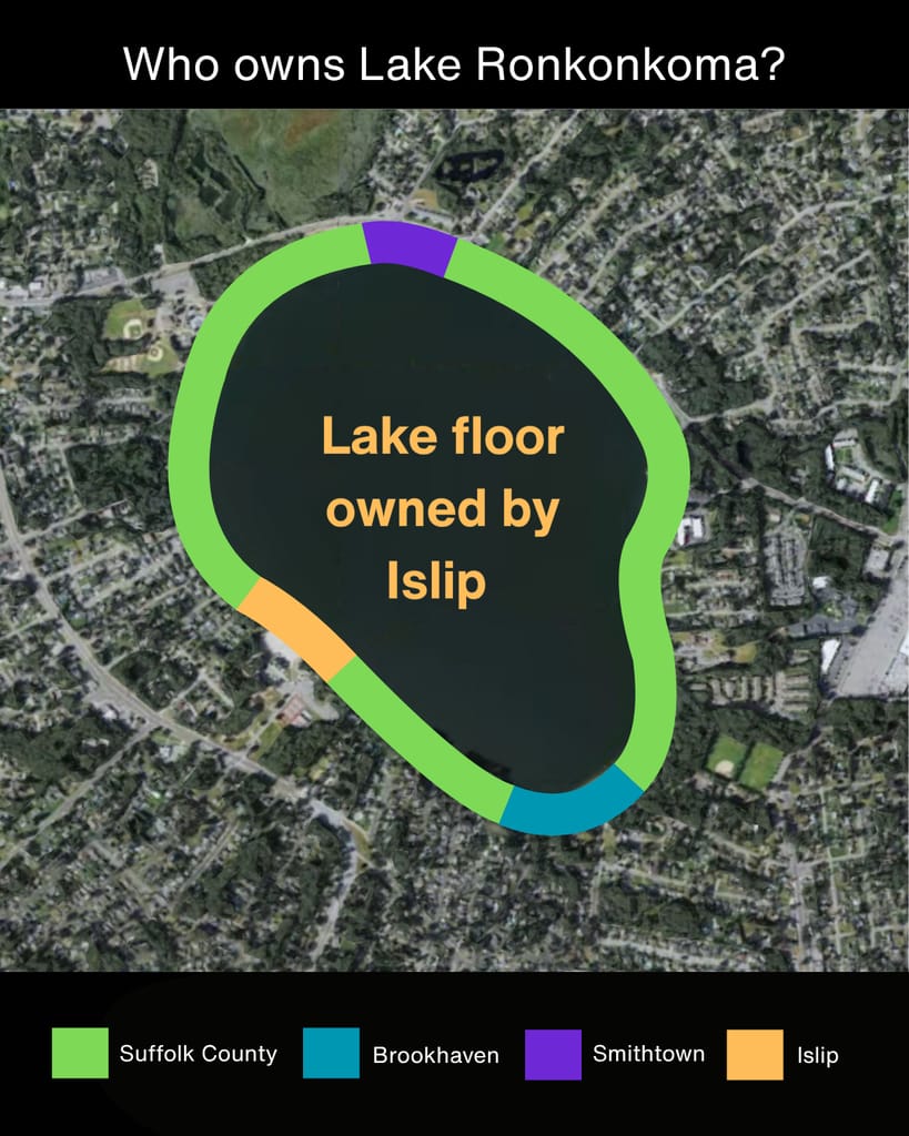 The rest of the beaches are broken up between different municipalities (see the graphic below): Starting from the bottom tip of the lake going clockwise, the Town of Brookhaven owns Lt. Michael P. Murphy Memorial Beach; the Town of Islip owns the floor of the lake and Ronkonkoma Beach; Suffolk County owns plots of land after Ronkonkoma Beach to Lake Ronkonkoma County Park; the Town of Smithtown owns plots of land after county park; and Suffolk County owns the land from the top of the lake all the way down the east side until it reaches Lt. Michael P. Murphy Memorial Beach.