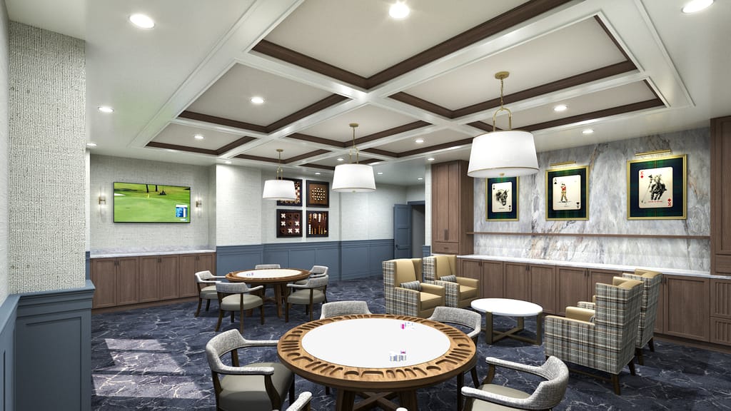 Newly imagined common spaces include a redesigned lobby and reception area, a lounge and bar, card and game rooms, and a speakeasy-style wine cellar intended for smaller gatherings and social events.