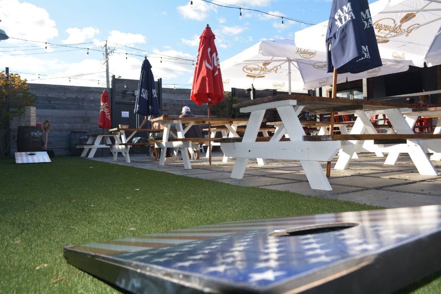 The big draw is going to be weekends in the big outdoor beer garden, where there’s picnic tables, massive umbrellas and lawn games like cornhole and Jumbo Jenga all set up (more photos below.) The patio’s also pet friendly.
