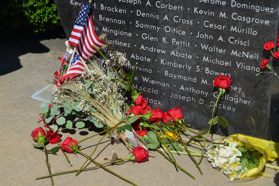 90 flags were placed around the 9/11 memorial to represent each of these individuals. Many families approached the memorial to touch the engraved names of their loved ones, as well as placed flowers, flags, and photos in front of the tribute.