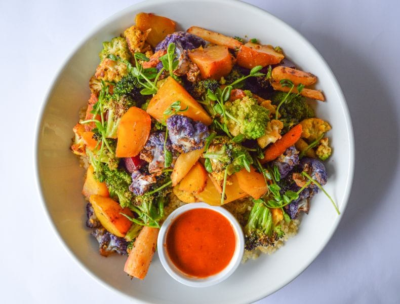 Consider the array of goodness that will go into The Greenery’s Veghead Bowl: blackened sweet potatoes, caramelized sumac onions, sliced almonds, sunflower seeds, sautéed kale, turmeric cauliflower, brown rice and smoky mayo.