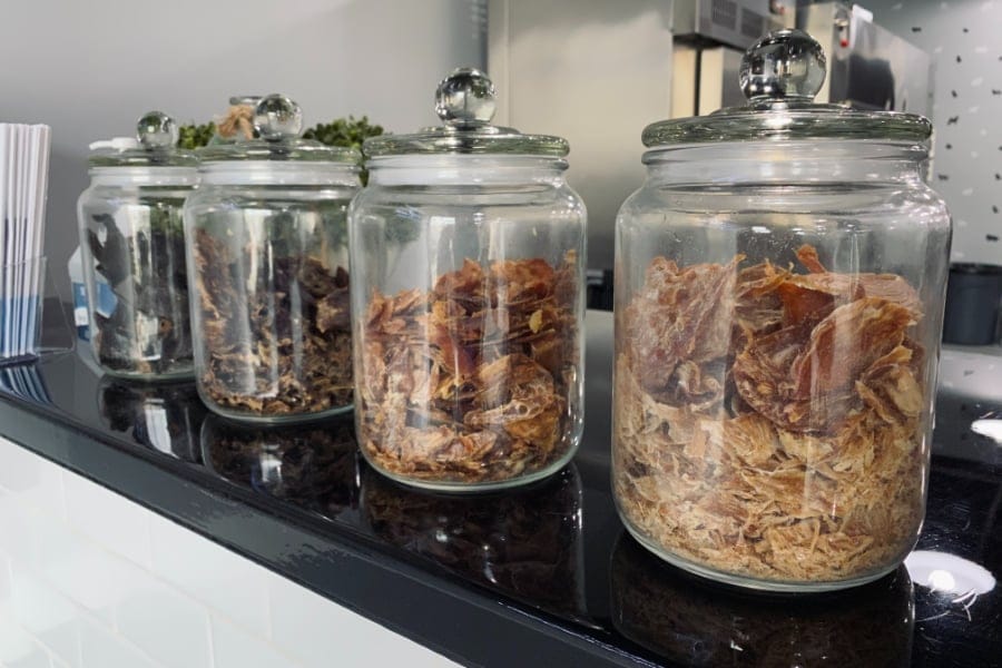 The store also sells peanut butter and pumpkin biscuits, bully sticks, and frozen Greek yogurt-based treats, as well as leashes, CBD oil for dogs and some toys. Like their food, Wooley and Orlandi’s store is dog-friendly.