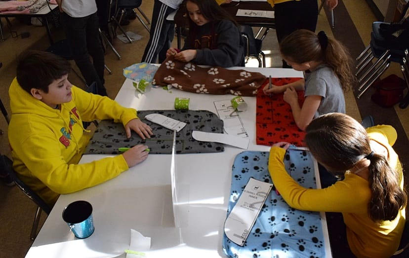 Lily Rosengard in the center, surrounded by members of the student council helping to make Joey Pouches