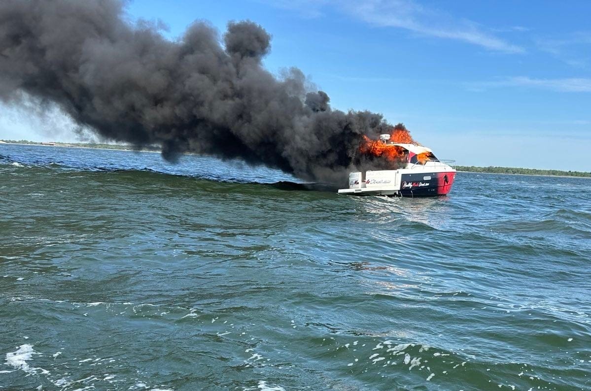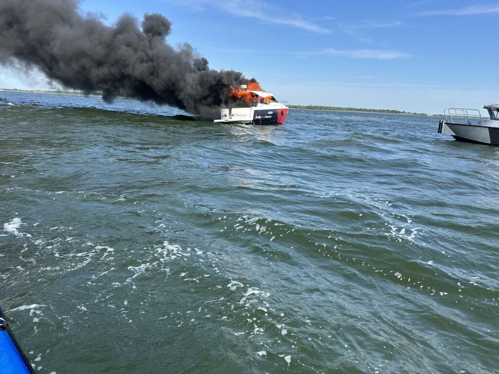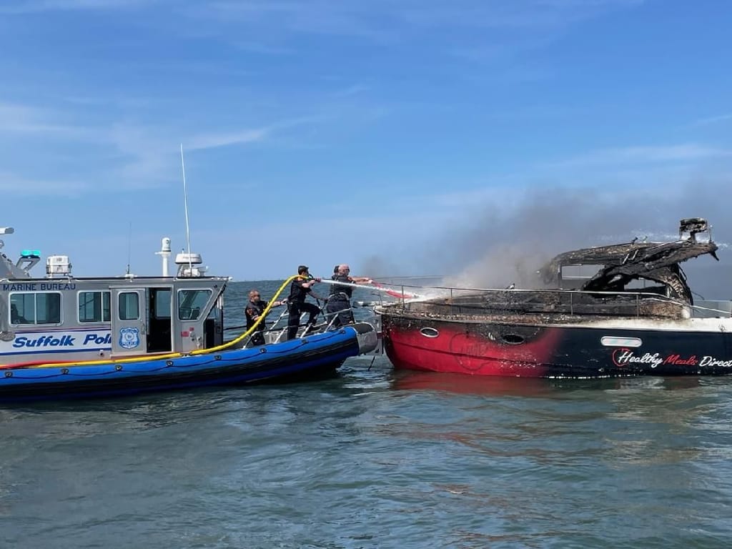 The drama began to unfold around 9:30 a.m., as black smoke from a boat billowed into the air from the middle of the bay with officers from the Suffolk County Police Marine Bureau en route.