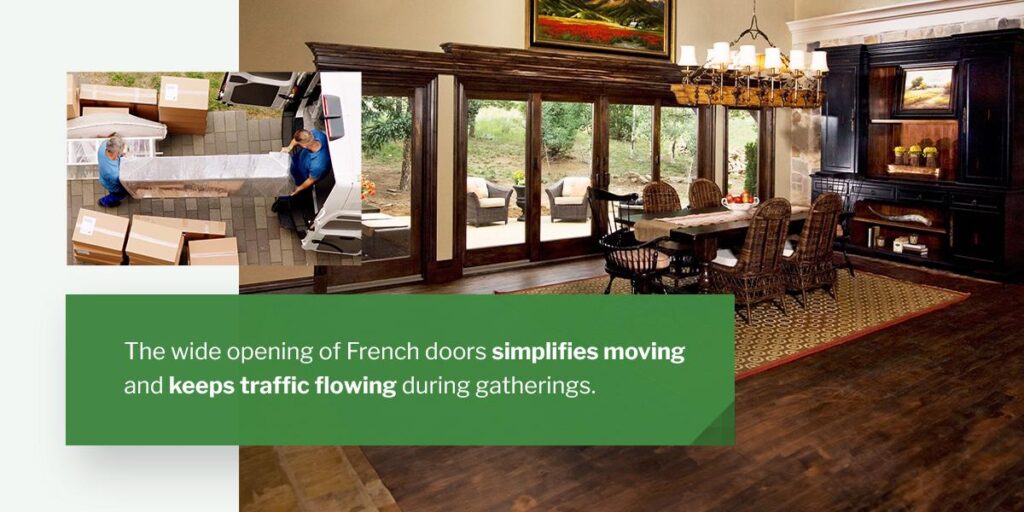 Sliding French doors can still have all the architectural elegance of traditional versions. That makes them a perfect fit for traditional home compatibility. A single door can be installed to slide to one side or the other, while a double door can open in the middle and slide to each side.