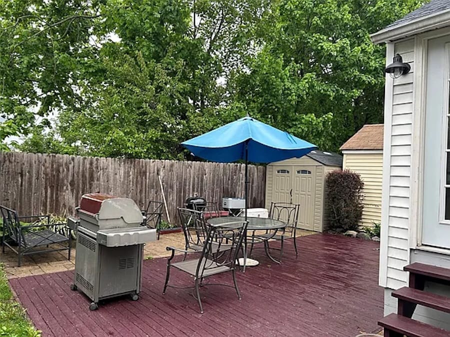 Out back, the fully fenced yard includes a detached one-car garage, patio space and a shed — all flanked by neat landscaping and bordered by mature trees.