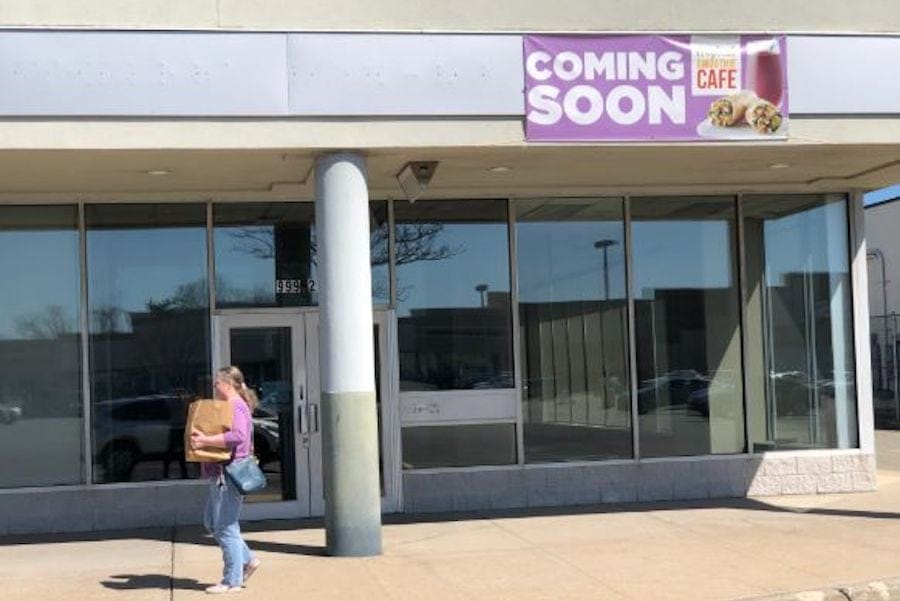 A vinyl sign proclaiming the smoothie and healthy treats take-out place’s imminent arrival is posted on a storefront two doors down from Savorona Pizza. It’s across the parking lot from one of the plaza’s anchor stores, Kohl’s.