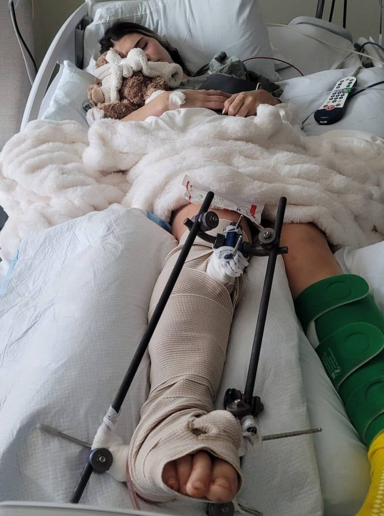 Three inches of Gargano’s tibia are missing. Her fibula is fractured and most of the skin and muscle on her lower leg and foot are severely damaged.