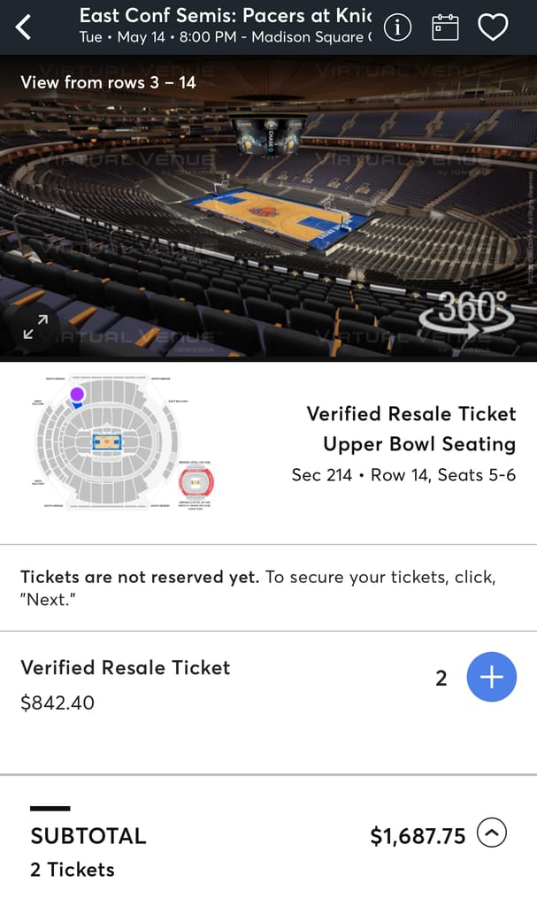 Here we are in Round 2 again, with a rematch against the Pacers. The Knicks are up 2-0. Tickets to get into MSG are exorbitant. Look at this: