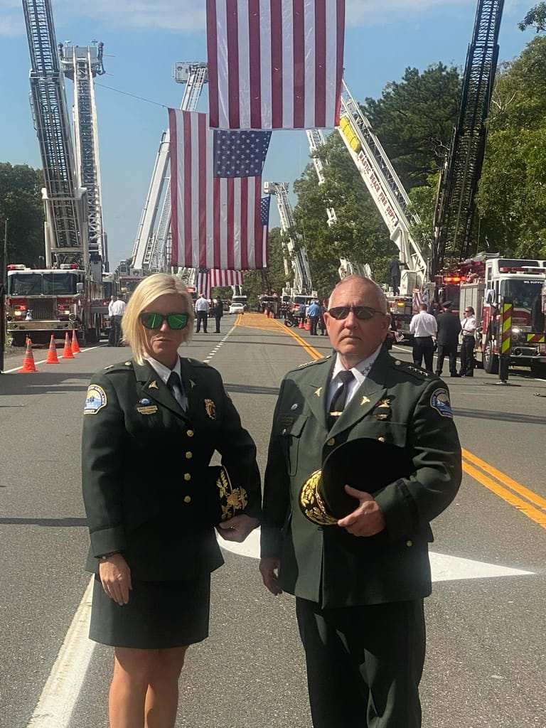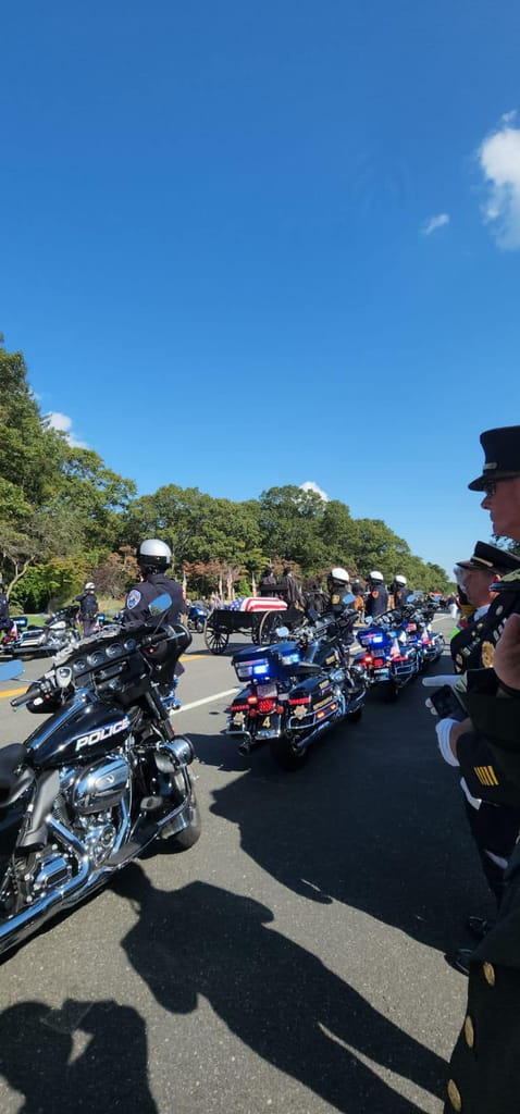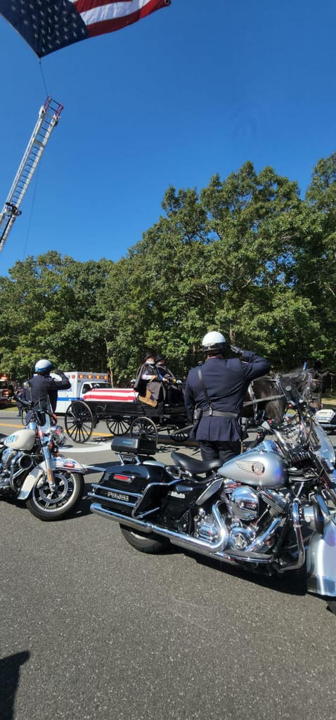 In a hero’s welcome, Sweeney’s remains were escorted in a horse-drawn caisson along an extensive funeral procession lined with service men and women, veterans, first responders and other Long Island residents. His path of tribute to the cemetery included giant American flag banners draped from fire trucks.